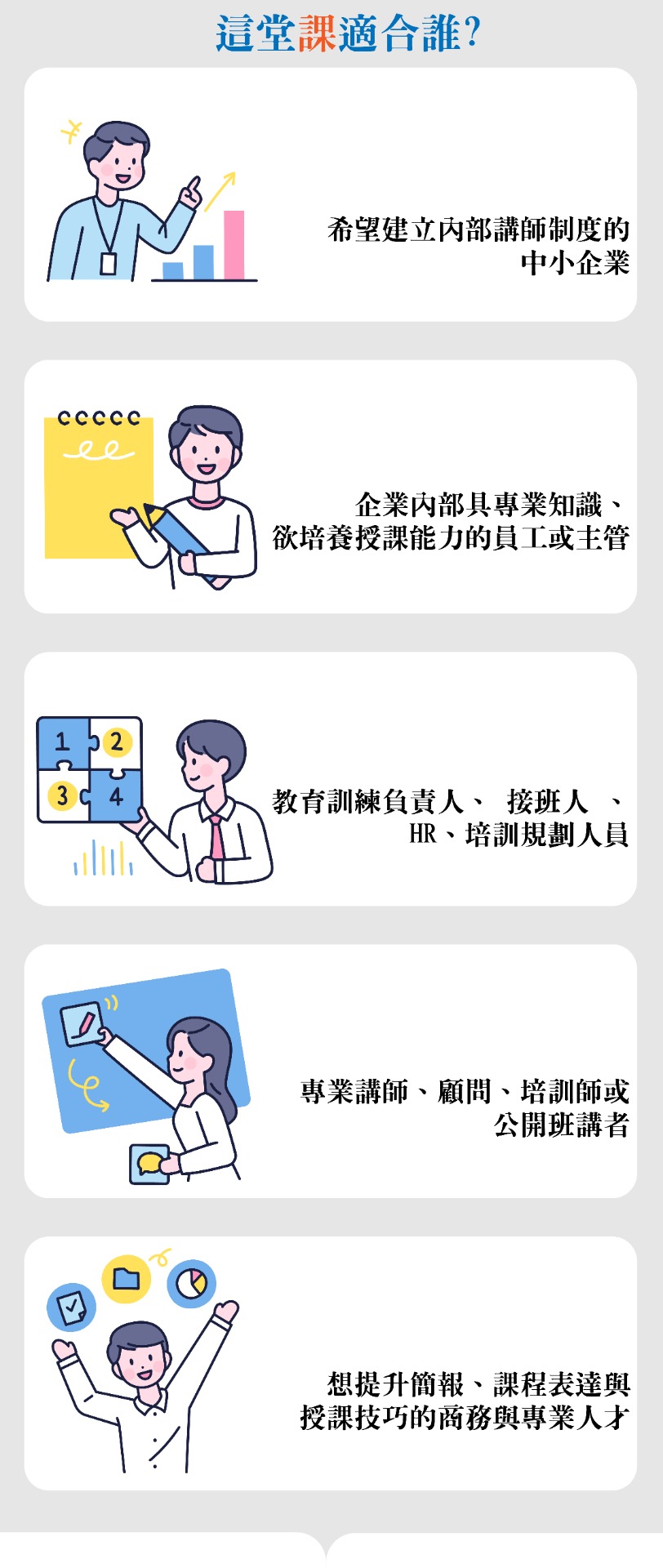 ✅ 企業內具專業知識、欲培養授課能力的員工或主管